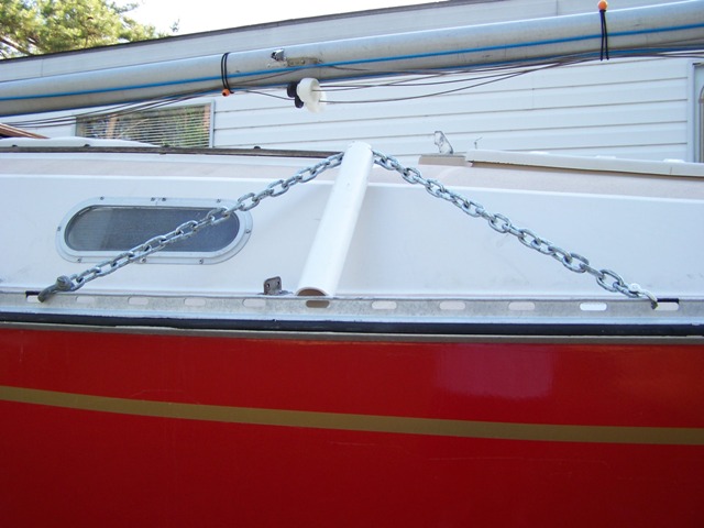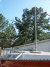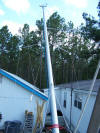 Here it is a few feet up, as you can see I have attached two bungee cords to take the slight slack left in the chain because I still am a bit short on the rail bridle part of the rig. I was raising this by myself and could stop to take pictures with no swaying of the mast.