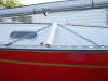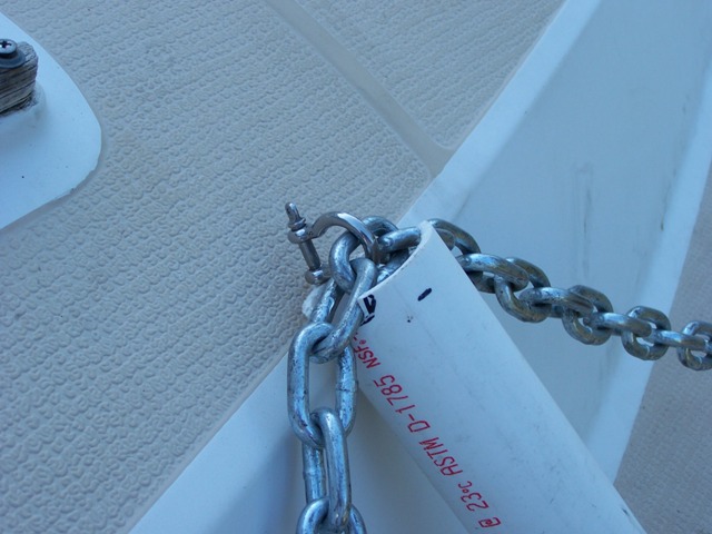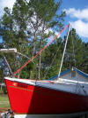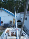 This is my new bridle for raising the mast. I have used a piece of PVC to keep the bridle vertical to minimize the sway of the mast during raising and lowering. I have also marked the rail attachment points so I don't have to hassle with figuring out which holes to use. In the close up you can see how I have shape the bottom of the PVC to allow it movement as the angle changes. A small shackle provides a point to hook the lines. I'll have also made up a separate jin pole for raising because using the boom was a pain. I'll be getting some pictures of it and a step by step mast step soon. The chain is larger than needed and so are the attachment shackles, they were just what I had laying around. I have also found that these 12" long bungee cords with the balls are perfect for tying up those cables and keeping them secure during the trip to and from the launch. Well here it is rigged up and ready to go up. The X support quickly breaks down into 3 pieces that will fit in the 6. bed of my truck. The bottom half of the legs slide up onto the top section.