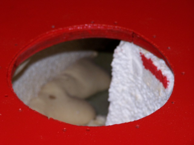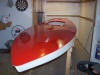 I added two 8" inspection ports and reinforced the areas with 1/2" plywood. Once this was done I painted the topsides with Interlux Brightside paint. I installed the ports, coaming, rub rails and misc fittings and she was ready to go. I used 3M 5200 caulk to seal all penetrations. Reinforced inspection port. New center board and rudder made out of red oak. |